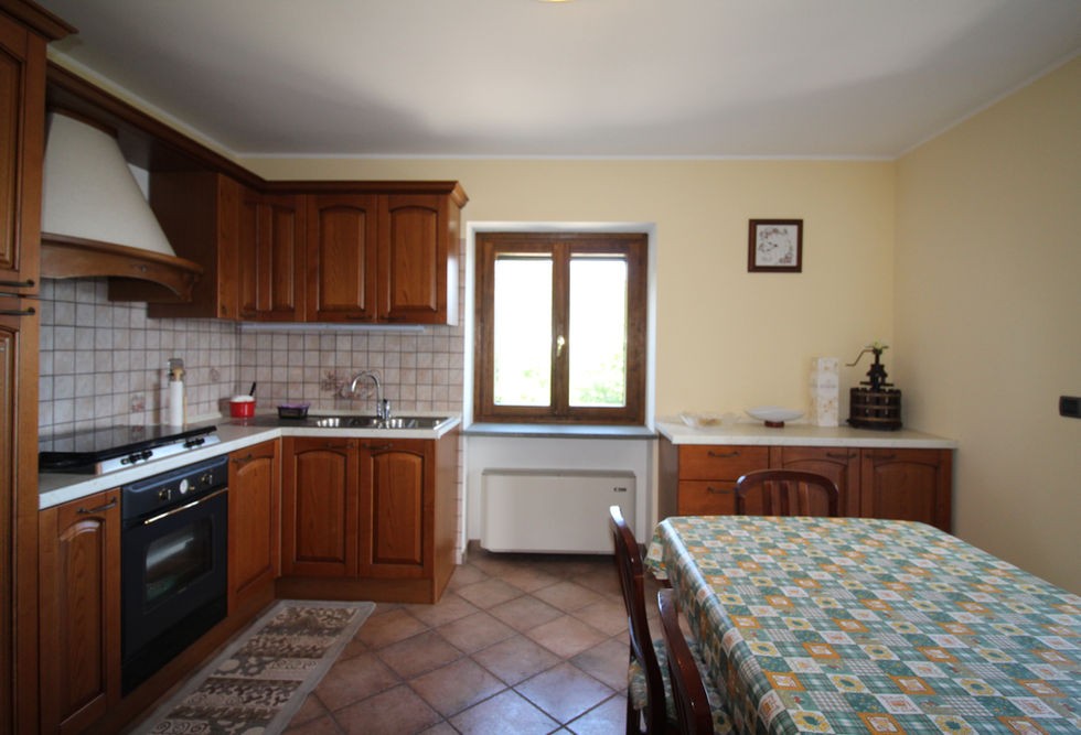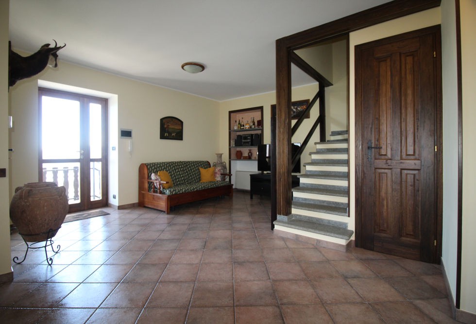 Piano primo ingresso con salone con camino e cucina, ambiente unico, bagno, balcone e scala di accesso al piano superiore